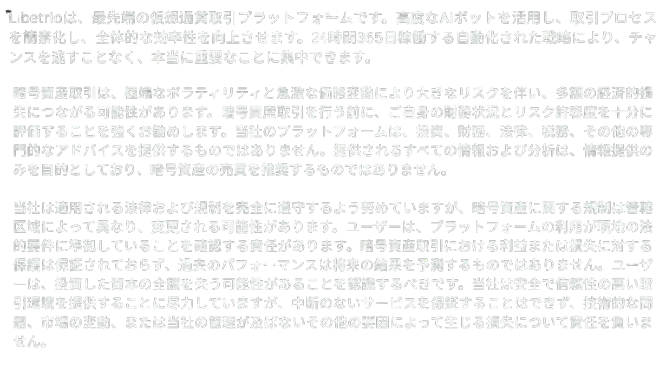Libetrioは、最先端のAI技術を活用した自動暗号取引プラットフォームです。初心者から上級者まで、誰でも簡単に高精度な取引を始められます。今すぐ登録して、次世代の取引体験を始めましょう。
